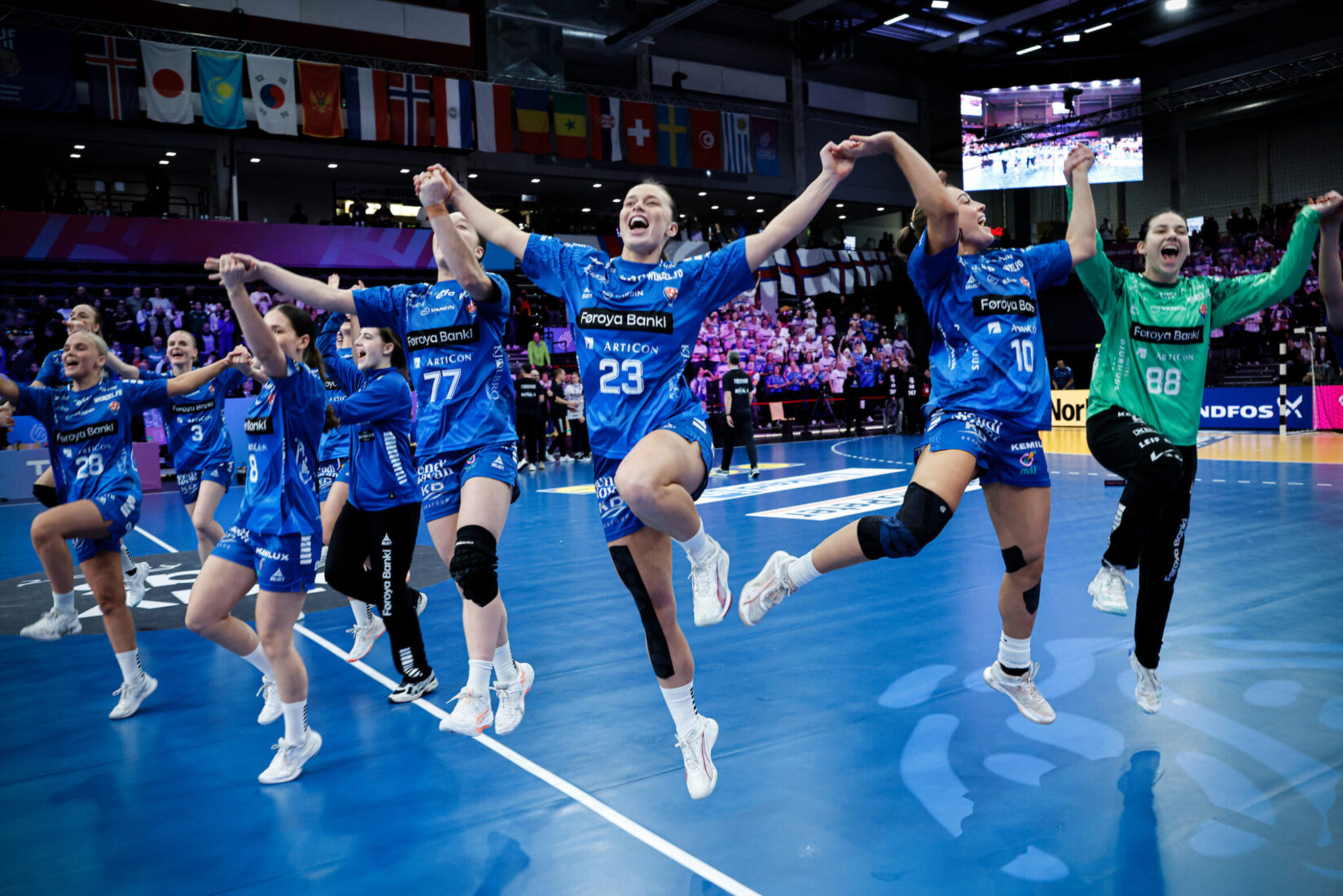 Føroyska liðið fekk eina torføra byrjan uppá dystin í dag. Álopsspælið var leitandi og komu kjansirnir fyri tað mesta á vengrunum, har okkara tíverri vóru óhepnar í avgreiðsluni. Saman við fleiri tekniskum villum, gjørdi hetta at Svøríki fór fram um 7-2, áðrenn okkara aftur minkaðu um munin. Okkara ernaðust tó so líðandi, føroyska spælið hekk betri saman og vunnu okkara í størri mun dystirnar ein móti einari og eftir 18 minuttir stóð á jøvnum 9-9. Dysturin var hereftur javnur fram til hálvleiks, har tað tó var Svøríki, sum hevði munin og var á odda 16-14.